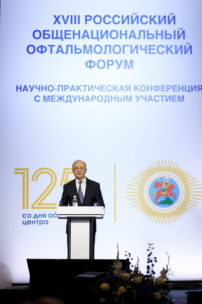 С краткой речью перед участниками и гостями конференции выступил министр здравоохранения РФ М.А. Мурашко. В частности, он сказал: «Сегодня офтальмология в нашей стране получила большое, серьезное развитие. Для этого есть история открытий, история великих людей, которые развивали эту отрасль. На сегодняшний день 242 медицинских организации оказывают высокотехнологичную помощь по данному профилю. Развиваются телемедицинские технологии не только в отношении оказания медицинской помощи, но и консультирования, и сегодня количество ежегодных консультаций составляет более 7000. Причем, хочу отметить, что в этом году идет прирост. На сегодня (до конца года еще целый квартал) проведено уже более 5000 телемедицинских консультаций. Это связано, в том числе, с повышением качества оказания медицинской помощи, это и обучение, это и оказание помощи бойцам, которые находятся в зоне СВО.